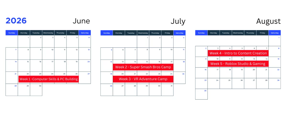 X-Campers focus each week on one area of interest and learn from expertly developed curricula and talented instructors. They will develop real-world skills from hands-on, experiential learning in a fun and dynamic camp environment. We update our camp roster every year with topics such as: Coding, Content Creation, Specialized Esports Training, PC Building, Twitch Streaming, and much more.